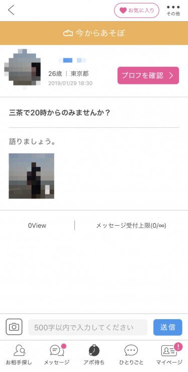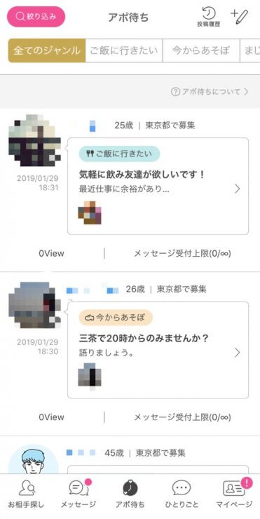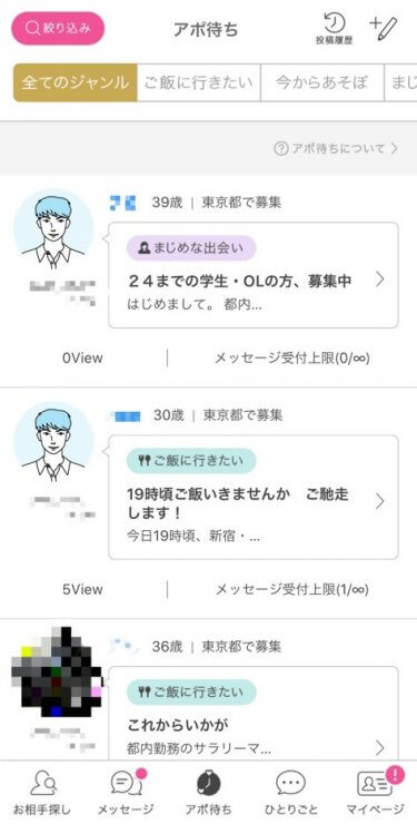 アポ待ちとは、掲示板のようなもので「会いましょう」とお誘いの文を投稿する機能になります。