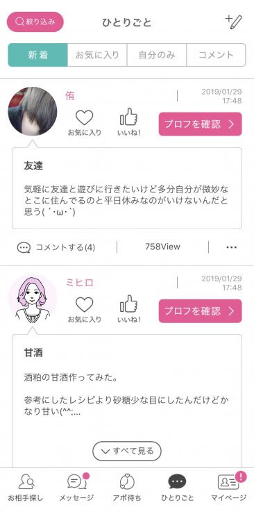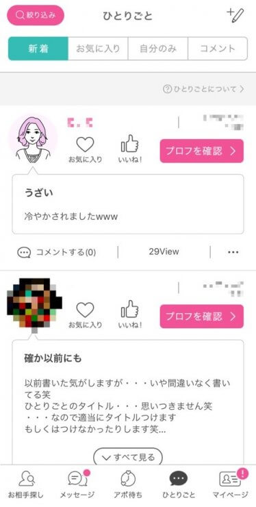 ひとりごとは、Twitterのような機能で、その投稿に「お気に入り」や「いいね」や「コメント」をつけれます。