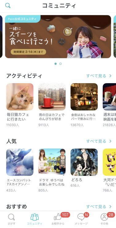 また、コミュニティが充実しており、趣味から相手を探せるのでかなり重宝されています。