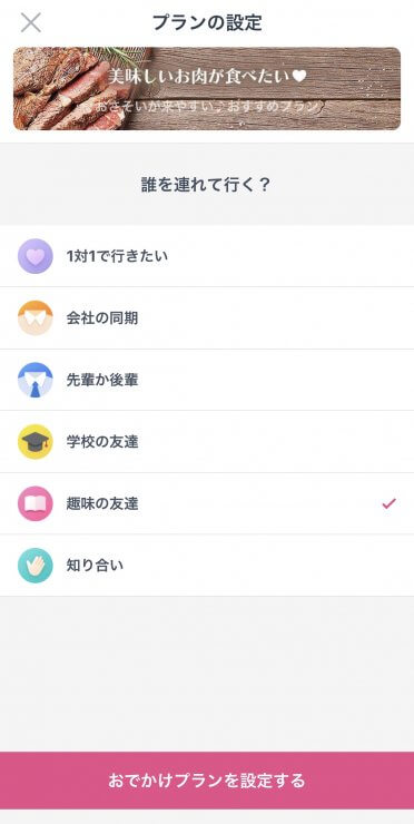 連れて行く友人とのつながりを選択して、「おでかけプランを設定する」を押すと投稿完了です。